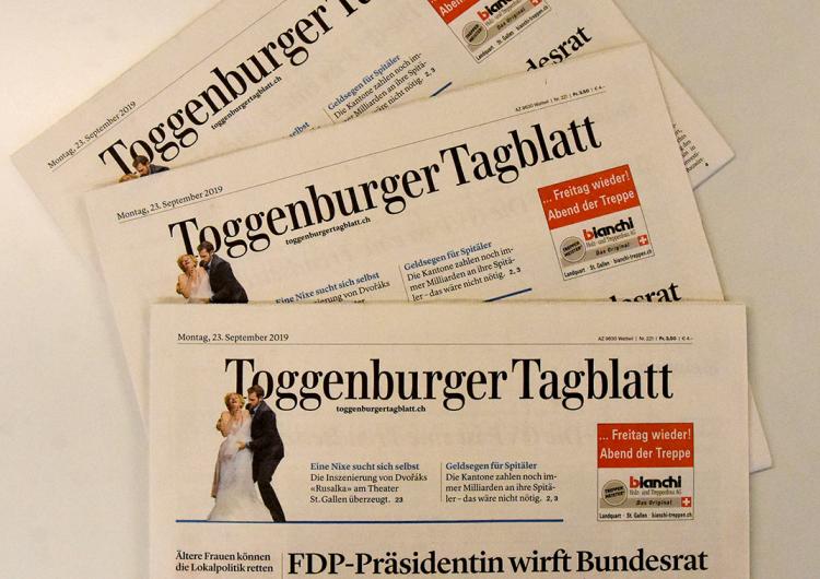 Das Toggenburger Tagblatt ist die regionale und lokale Tageszeitung für Leserinnen und Leser, für Behörden, Vereine, die Wirtschaft und für das Gewerbe im Toggenburg. Es steht für inhaltliche Qualität und nimmt seinen Informationsauftrag und die lokale Verantwortung gegenüber dem Toggenburg wahr. An sechs Tagen pro Woche berichtet das Toggenburger Tagblatt über Wirtschaft, Gewerbe, Politik, Sport und Kultur.