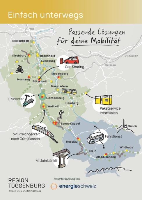Im Rahmen des Projektes «Mobilitätsökosystem Nesslau/Toggenburg» wurden Ideen entworfen, in einer Testphase ausprobiert und umgesetzt. Wir bieten Ihnen eine Übersicht und Hilfe, damit Sie Ihre Lösung für eine nachhaltige Mobilität entdecken oder entwickeln können.